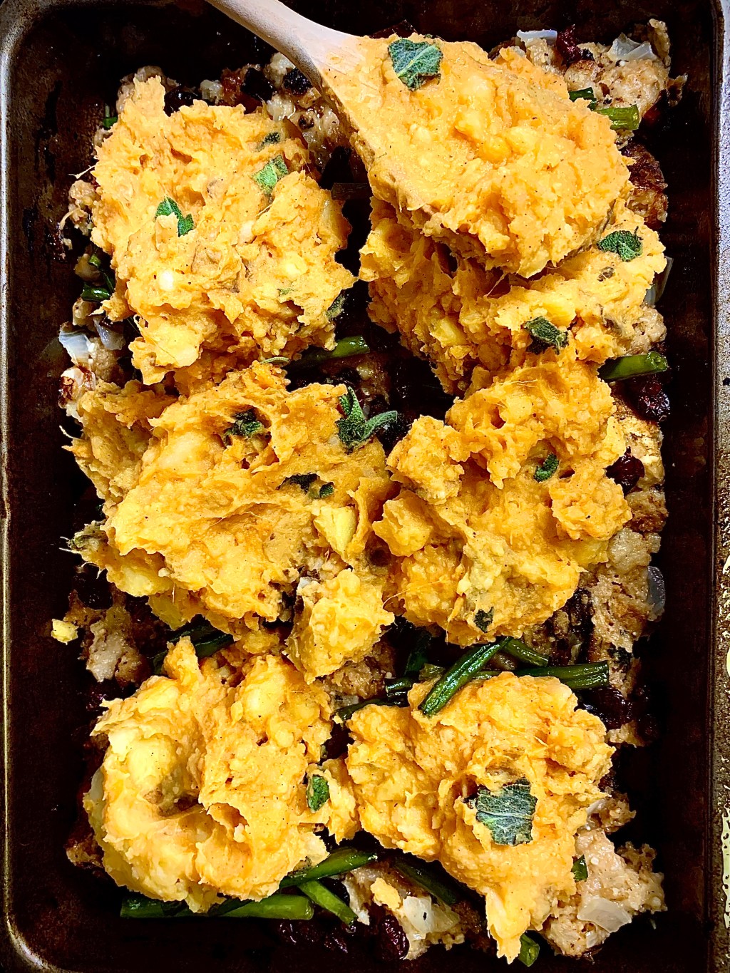 - All of your elements should be ready now– the pumpkin mashed potatoes, stuffing and green beans! All that’s left is to assemble!