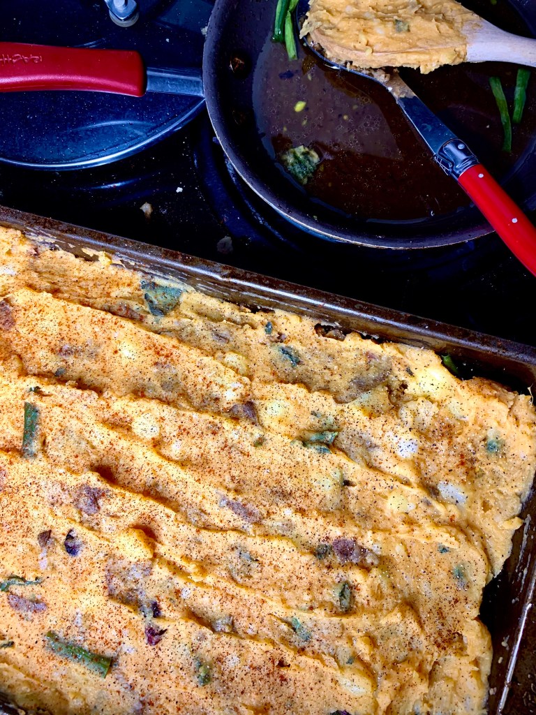 I am obsessed with winter vegetables and squash, so this year for Halloween I spent most of my day baking and puréeing whole pumpkin so that everything can taste like pumpkin for… quite a while; which is actually perfect, ’cause I am going to be making Thanksgiving-style food all month long. For this casserole, I decided to mash some of my pumpkin purée into the three-potato mash, and it turned out fantastic.