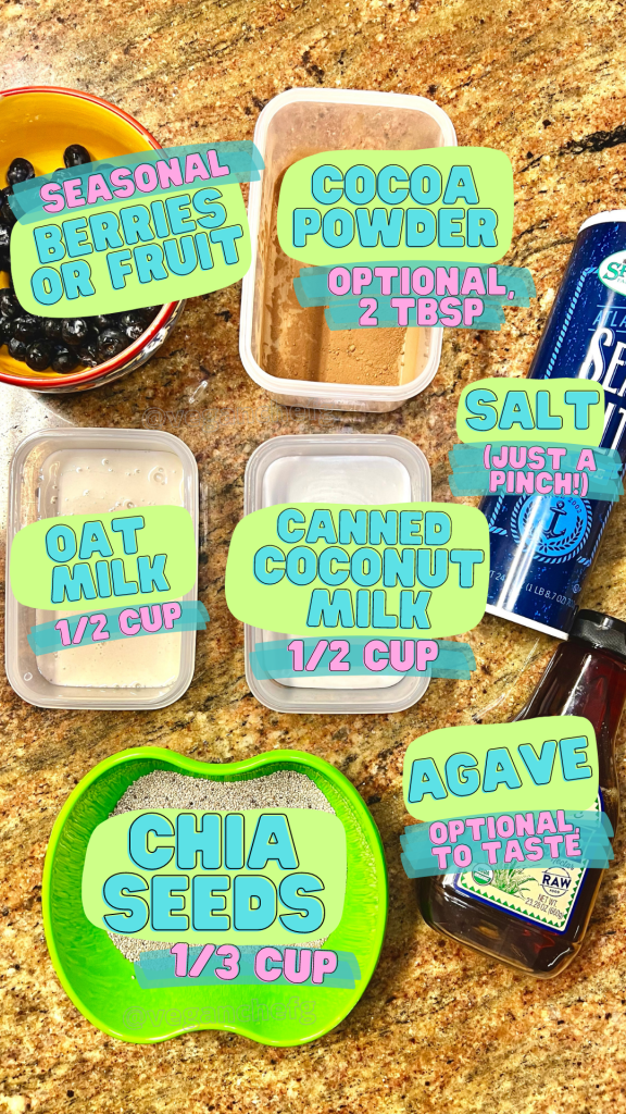 You can snag a bag of chia seeds from the store or online for about $6-7, and will not use all of it in this recipe. Once you’ve got the chia seeds, you really only need canned coconut milk and a bit of your plant-based-milk-of-choice, mixed with your chosen flavors. You can make this recipe a few times out of a standard-sized bag of chia seeds, and can pull each batch together for as cheaply as you want– all you’ll need is the $2 can of coconut milk.
