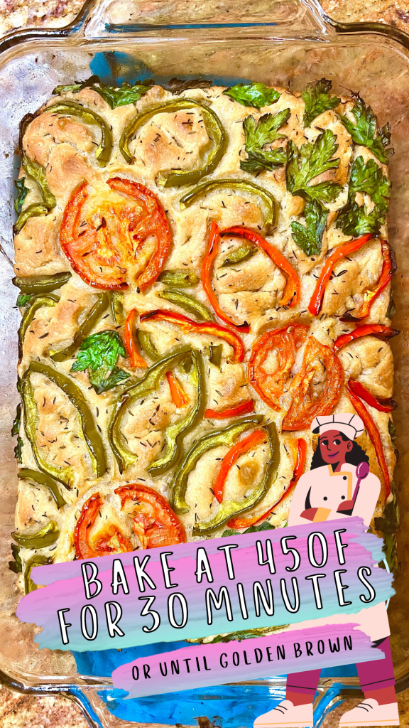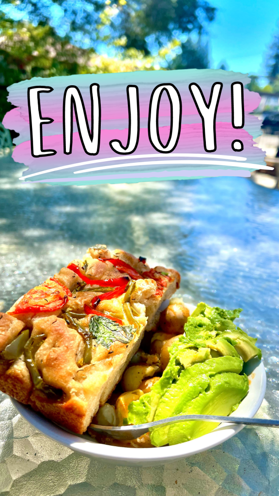 Just like most breads, this focaccia also freezes extremely well, so there’s no risk that it could go to waste. I used this loaf throughout the week for my work lunches– one day with roasted breakfast potatoes and fresh avocado, which paired brilliantly with the bell peppers, garlic, herbs and tomatoes I used in the bread itself. Another day that week, I sliced & toasted the same bread to have a FBLTA (Fake-Bacon + Lettuce + Tomato + Avocado) and it was beyond decadent and delicious.